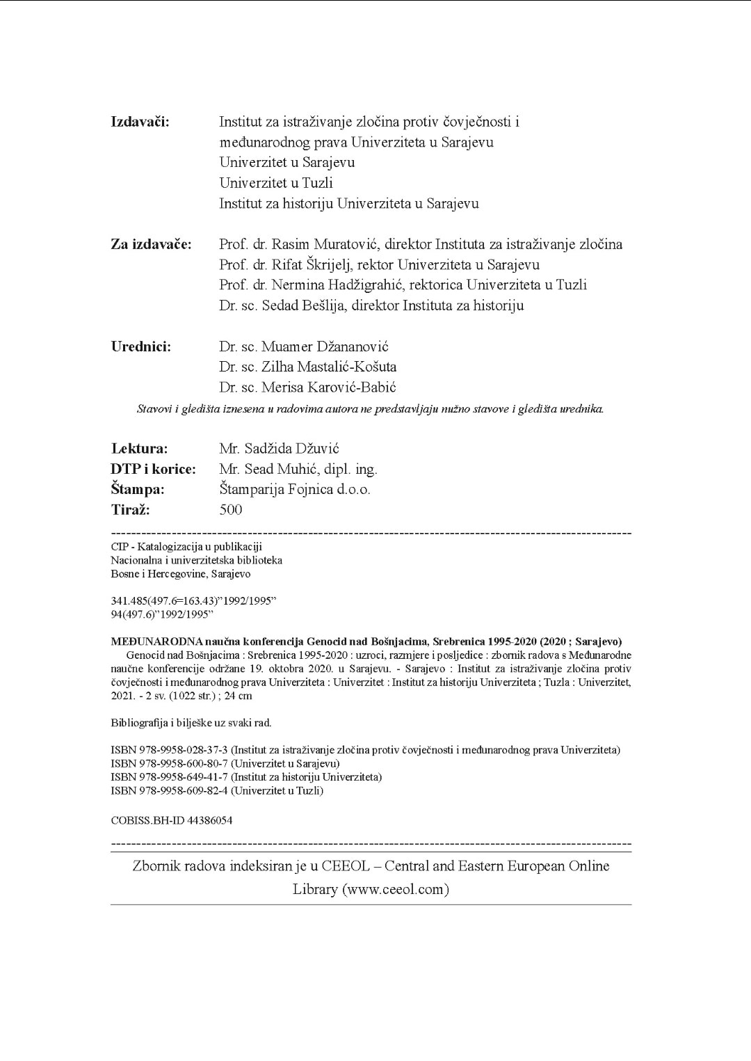 U okviru obilježavanja dvadeset šeste godišnjice od genocida u Srebrenici i oko nje Univerzitet u Sarajevu, Institut za istraživanje zločina protiv čovječnosti i međunarodnog prava Univerziteta u Sarajevu, Institut za historiju Univerziteta u Sarajevu i Univerzitet u Tuzli objavili su zbornik radova s Međunarodne naučne konferencije pod nazivom GENOCID NAD BOŠNJACIMA, SREBRENICA 1995-2020: Uzroci, razmjere i posljedice, koja je održana 19. oktobra 2020. godine u Sarajevu.