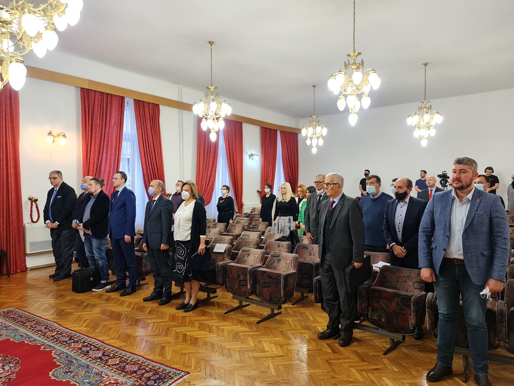 1Naučni skup “Ustavnost Bosne i Hercegovine kroz historiju” su pozdravnim obraćanjima otvorili dr. Sedad Bešlija, direktor Instituta za historiju Univerziteta u Sarajevu i prof. dr. Rifat Škrijelj, rektor Univerziteta u Sarajevu.